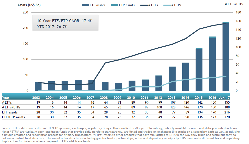 At the end of June 2017, the Japanese ETF/ETP industry had 188 ETFs/ETPs, with 233 listings, assets of US$220 Bn, from 21 providers listed on 2 exchanges.