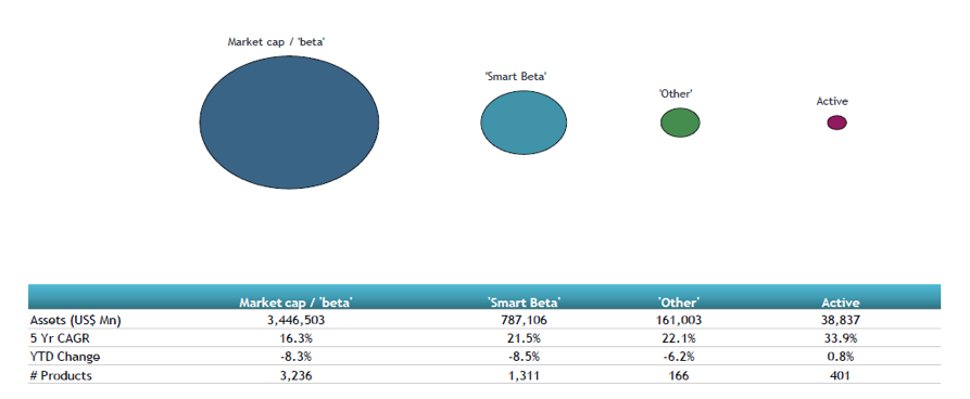 - Assets invested in Smart Beta Equity ETFs/ETPs decreased to $787 billion, but are at the 5thhighest level on record.